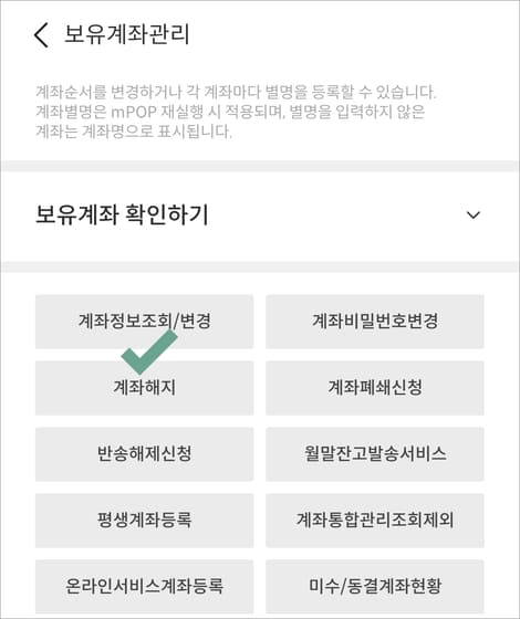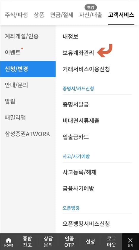 전체 메뉴 화면으로 이동하면 상단에 고객서비스 탭을 선택하고 신청/변경에서 보유계좌관리에 들어갑니다.