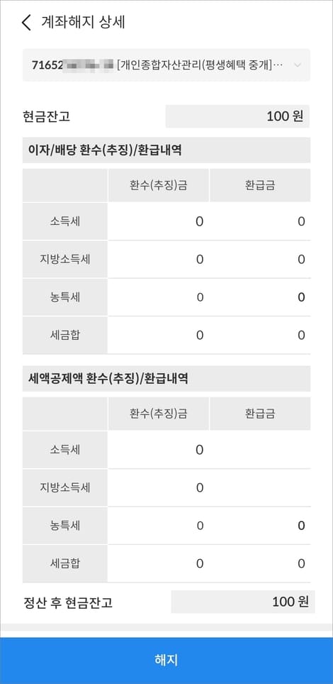 현금잔고/이자/배당 환수/환급내역/세액공제액 환수/정산 후 현금잔고를 확인하고 하단에 해지 버튼을 눌러서 안내에 따라 완료하시면 됩니다.