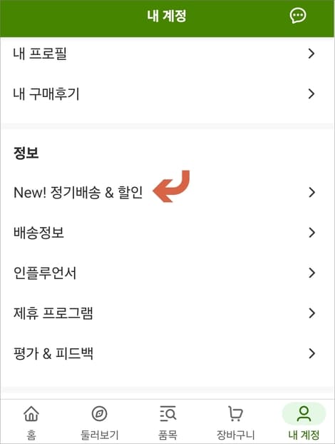 맨 하단에 내 계정 메뉴를 선택하고 해당 화면 아래로 내려가 정기배송&할인에 들어갑니다.