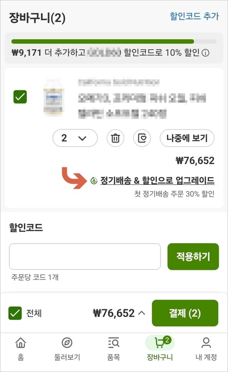 주문할 상품을 선택 후 정기배송&할인으로 업그레이드를 눌러줍니다.