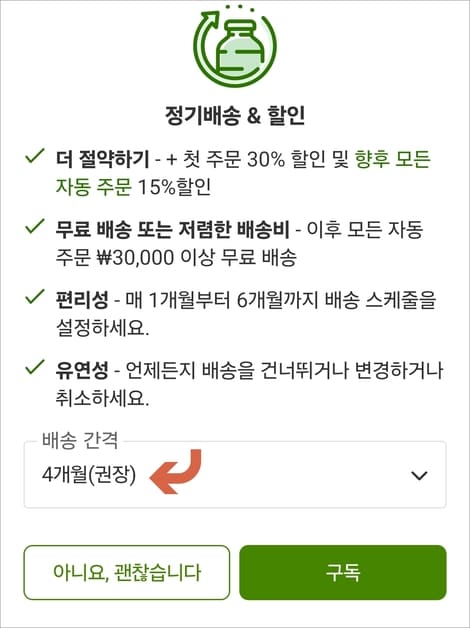 무료 배송 또는 저렴한 배송비(이후 모든 자동 주문 3만원 이상 무료 배송), 매월 1개월에서 6개월까지 배송 스케줄 설정, 언제든지 베송을 건너뛰거나 변경 취소할 수 있습니다.