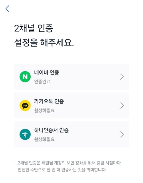 고개확인 후 2채널 인증을 진행하시면 계정을 좀 더 안전하게 보호할 수 있는데요. 네이버 인증/카카오톡/하나인증서 중에 선택해서 인증 완료하시면 계정 보안이 강화되고 출금할 때마다 인증 수단으로 한 번 더 인증을 진행하게 됩니다.