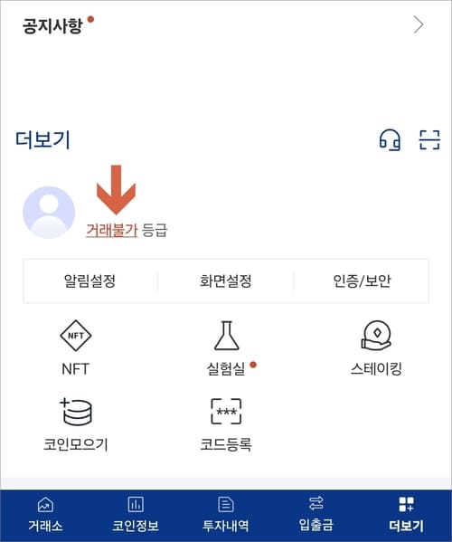 휴대폰 인증과 계좌 정보 입력으로 가입 완료 후 홈 화면 하단에 “더보기”를 눌러보시면 해당 화면 상단에 거래불가 등급을 확인할 수 있습니다. 거래불가 글자를 눌러줍니다.