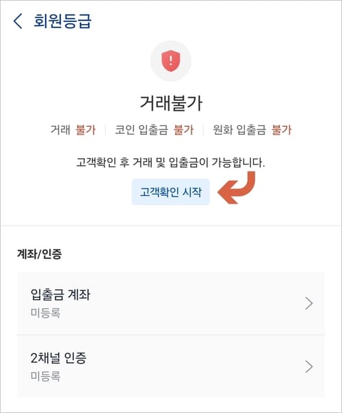 거래 불가 / 코인 입출금 불가 / 원화 입출금 불가를 확인하고 고객확인 시작 버튼을 터치합니다.