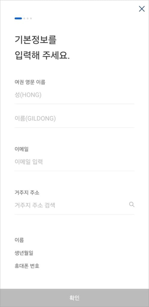 첫 단계에서 전체 동의(거래 유의 사항/개인정보 수집 및 이용 동의/고유식별 정보 처리 동의) 체크하고 여권 영문 이름과 이메일, 주소 등 기본정보를 입력합니다.