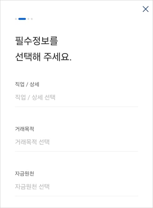 필수정보에서는 직업, 거래목적, 자금원천을 선택합니다.