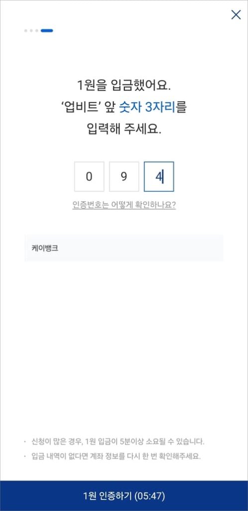 본인 명의 계좌번호를 입력하고 해당 계좌로 1원이 입금되면 거래 내역 조회에서 입금자명 업비트 앞에 표시된 숫자 3자리를 확인하고 화면에 입력합니다.