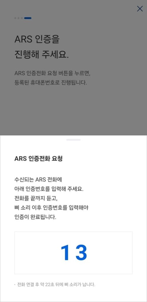 ARS 인증 단계에서는 전화통화로 화면에 표시된 숫자 두 자리를 휴대폰 키패드로 입력합니다.
