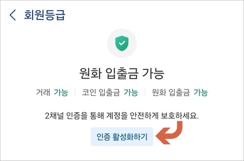 모든 인증 과정을 완료했다면 이제 거래와 입출금이 가능해집니다. 이후 인증 활성화하기 버튼을 눌러서 2채널 인증을 진행합니다.