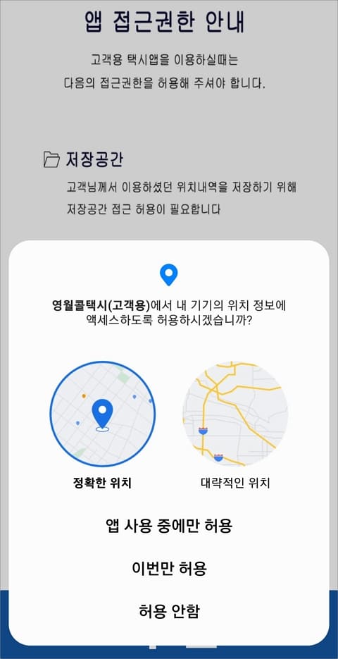 정상적인 앱 사용을 위해서 몇 가지 필수 권한 허용이 필요합니다. 첫째로 위치 권한이 필요한데요. 이용자의 위치를 파악하고 가까운 택시 차량을 찾아서 배차하는데 필요하며 둘째로 전화 권한은 차량 기사분이나 콜센터와 전화 통화하기 위해 필요합니다.