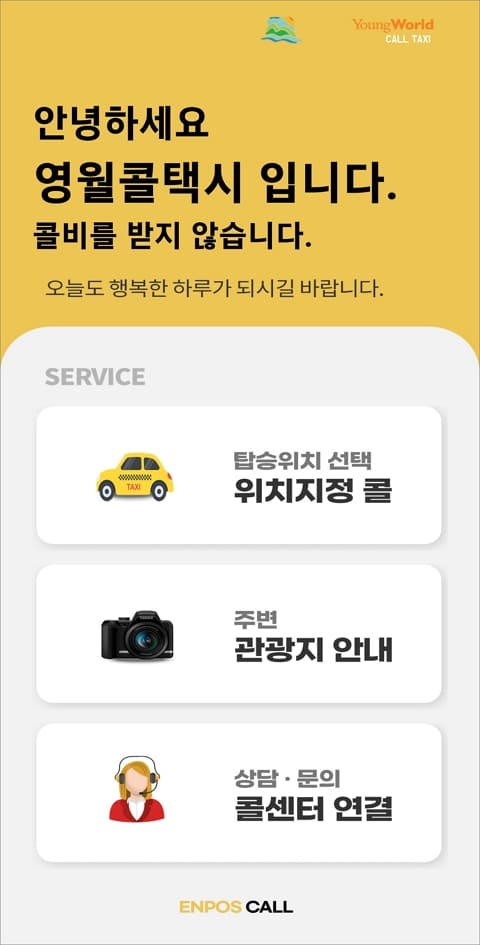 ▲ 홈 화면을 보시면 “탑승 위치 선택 위치지정 콜”과 “주변 관광지 안내”, “콜센터 연결” 메뉴가 표시되어 있습니다. 콜센터는 바로 전화 통화로 이어지고 관광지 메뉴 선택 시 영월 관광 웹사이트로 이동하게 됩니다. 택시 호출하기 위해서는 위치지정 콜 메뉴를 선택하시면 됩니다.