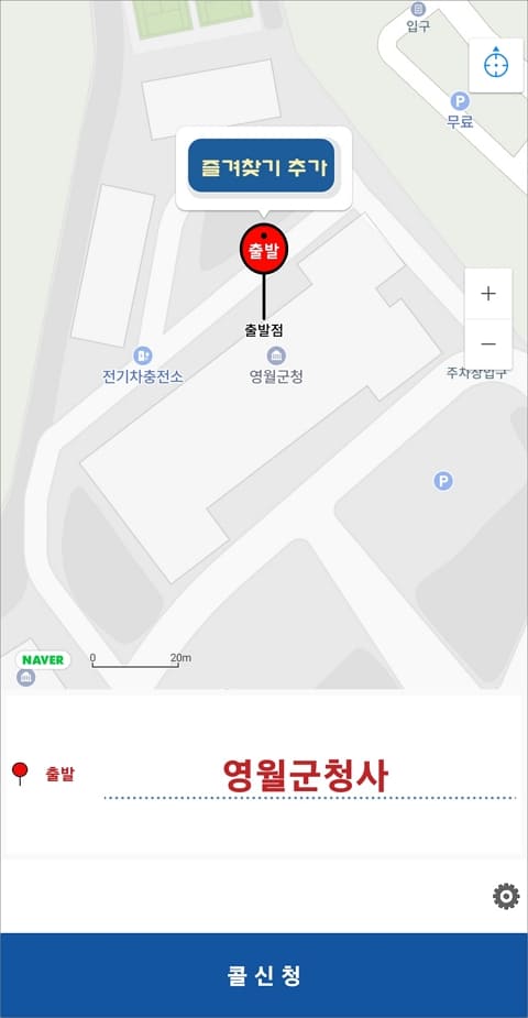 ▲ gps를 켜두었다면 현재 위치가 바로 지도 화면에 표시됩니다. 다른 장소에서 호출하고 싶다면 지도 화면을 손가락으로 눌러서 이동시켜 주시면 됩니다. 즐겨찾기 추가를 해주시면 다음 이용 시 편리할 수 있는데요. 화면 오른쪽 하단에 톱니바퀴 아이콘을 눌러주시면 추가한 즐겨찾기 관리(삭제)를 해줄 수 있습니다.