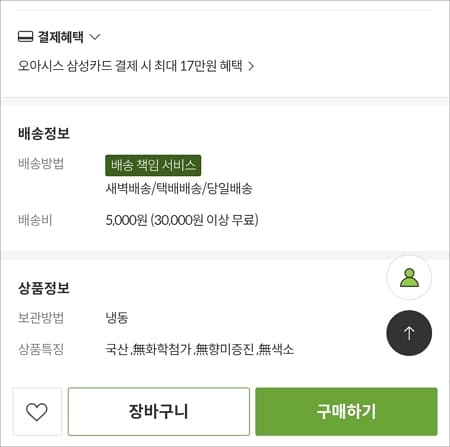 급하게 저녁 찬거리가 필요하다면 당일배송이 유용합니다. 오후 5시 전까지 주문하면 당일 밤 11시 전까지 도착합니다.