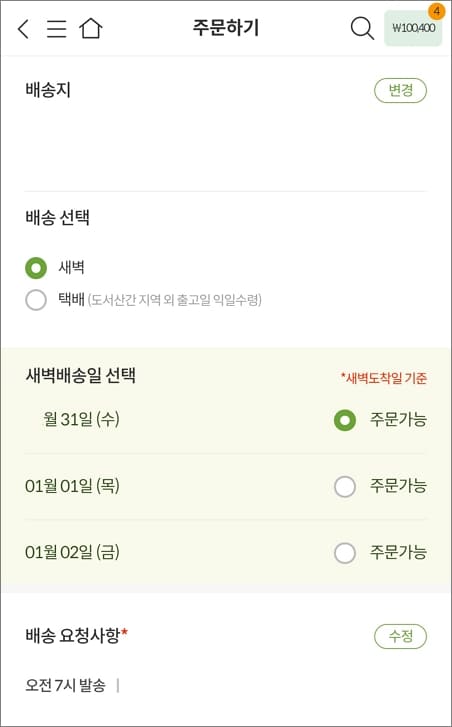 새벽 선택 시 새벽배송일도 선택해 줘야 합니다.