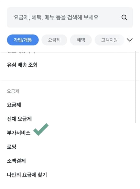 천천히 아래로 내려가서 요금제 항목에서 부가서비스를 선택합니다.