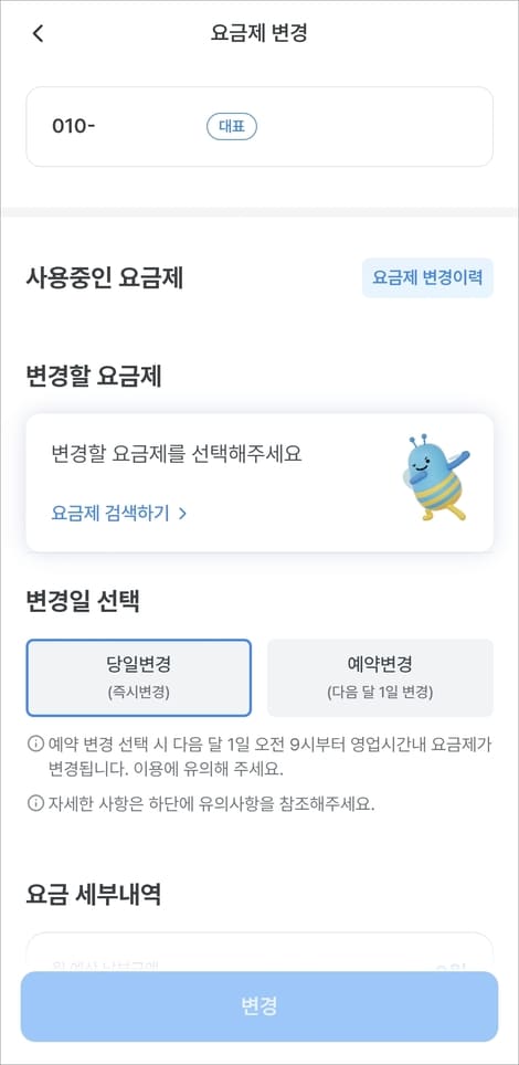 당일변경(즉시변경)과 예약변경(다음 달 1일) 중 선택해서 안내에 따라 신청 완료하시면 됩니다.
