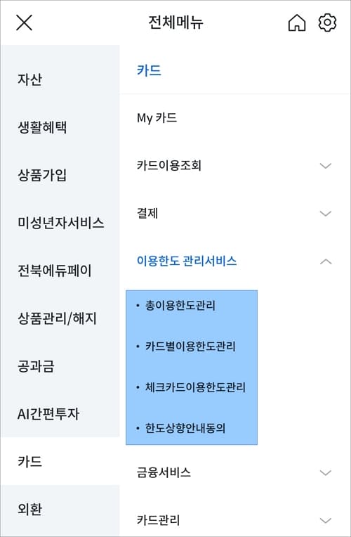 홈 화면 오른쪽 하단에 “전체” 메뉴를 터치하고 화면이 변경되면 카드> 이용한도 관리서비스 항목을 눌러줍니다. 그럼 총 이용한도 관리/카드별 이용한도 관리/체크카드 이용한도 관리/한도 상향 안내 동의 메뉴를 이용할 수 있습니다.