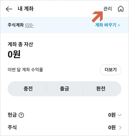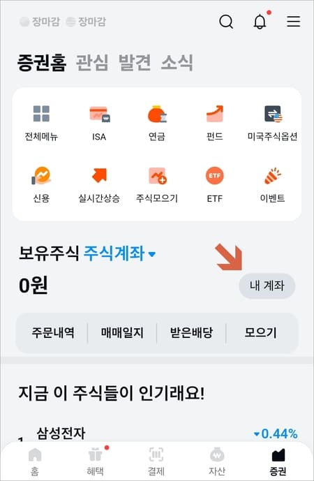 증권홈 화면으로 이동하면 보유주식 계좌 우측에 내 계좌 버튼을 눌러줍니다.