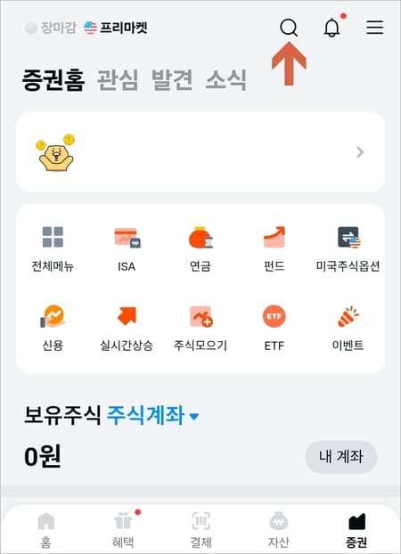 증권홈으로 이동하면 상단에 돋보기를 눌러주세요.