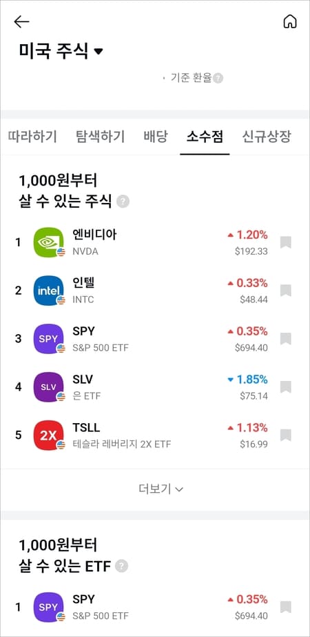 1000원부터 매수할 수 있는 주식 또는 ETF를 선택합니다.