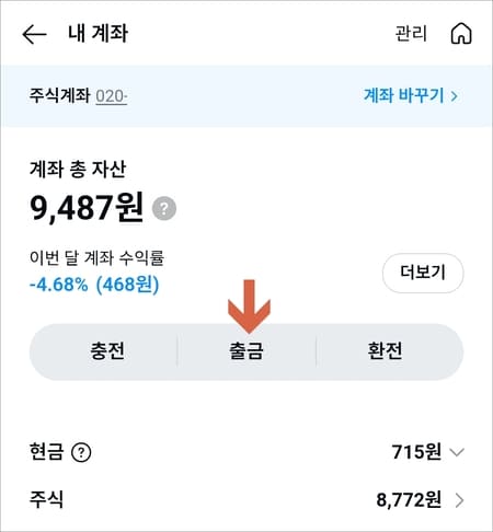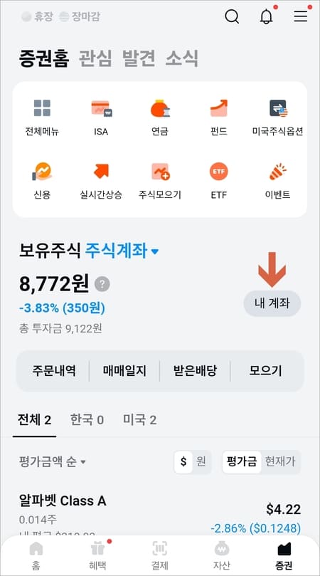 증권홈 화면으로 이동하면 보유주식 잔액표시 우측에 내 계좌 버튼을 눌러주세요.