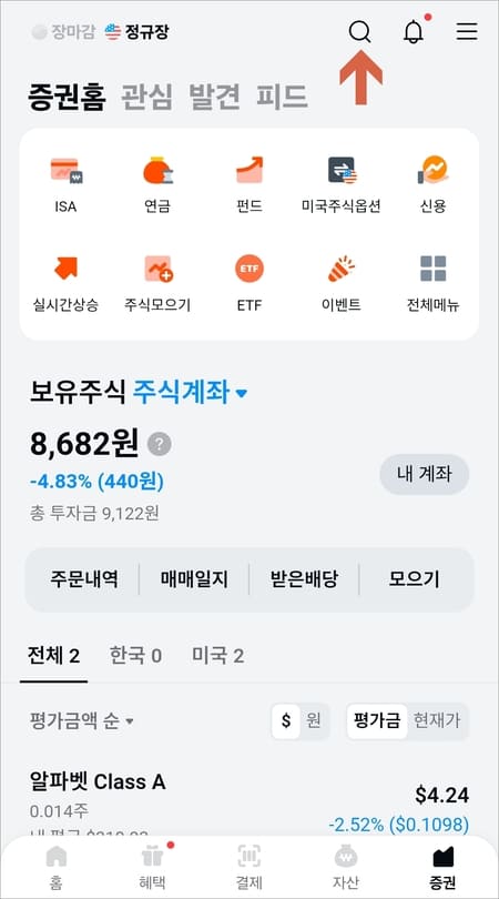 증권홈으로 이동했다면 상단에 돋보기 아이콘을 누르고 예약주문할 국내주식 또는 미국주식 종목을 검색해서 선택합니다.