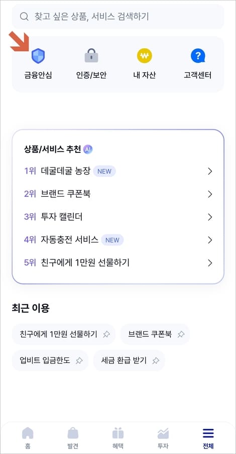 맨 하단 우측에 전체 메뉴를 누르고 해당 화면으로 이동하면 상단에 금융안심에 들어갑니다.