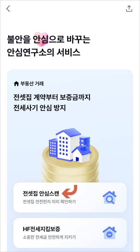 이름하여 전세집 안심스캔이라고 해서 계약하려는 집이 안전한지 미리 확인해 볼 수 있습니다. 해당 안심 서비스를 통해서 내 전세보증금을 좀 안전하게 지켜볼 수 있는데요. 계약하기 전에 집이 안전한지 확인해 주는 서비스입니다.