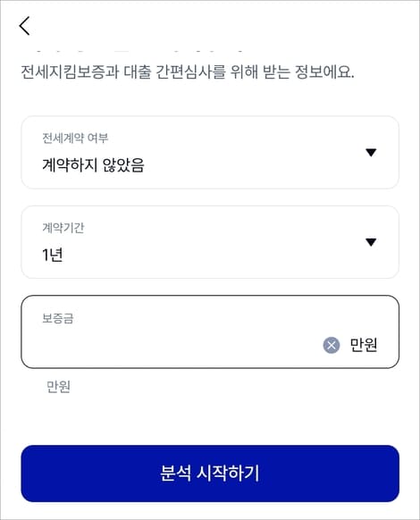 전세계약 여부와 계약기간, 보증금을 입력하고 분석 시작하기를 눌러줍니다.