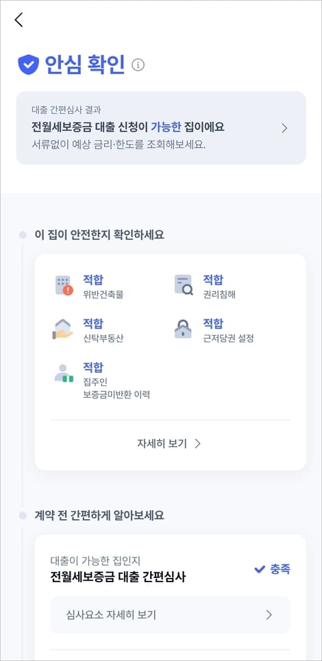 그럼 전월세보증금, 위반건축물, 권리침해, 신탁부동산, 근저당권 설정, 보증금미반환 이력에 대한 적합 여부를 조회할 수 있습니다.