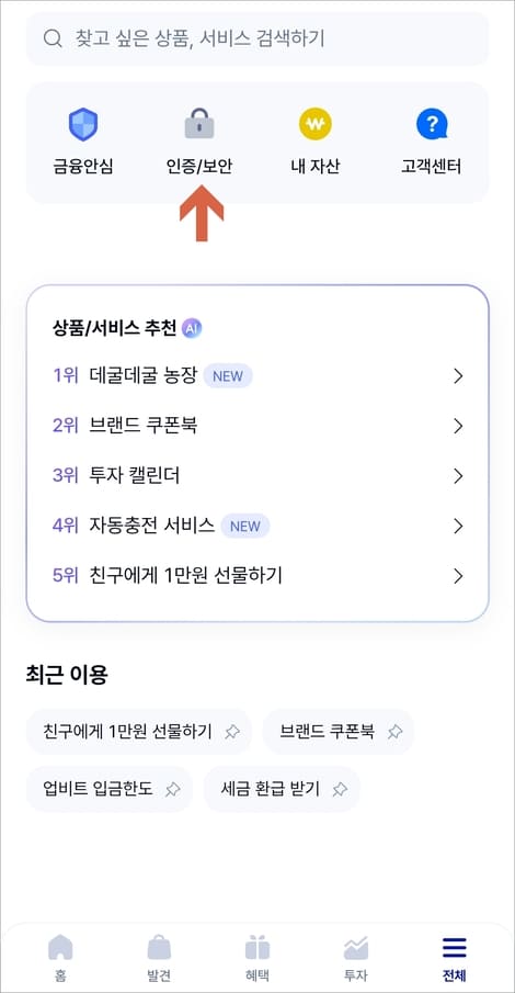 화면이 이동하면 상단에 인증/보안에 들어갑니다.