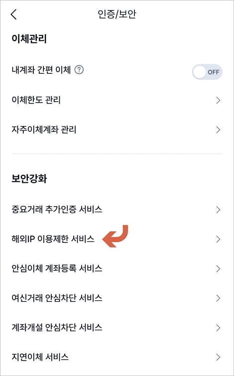 보안강화 항목에서 해외IP 이용제한 서비스를 선택합니다.
