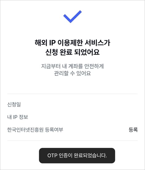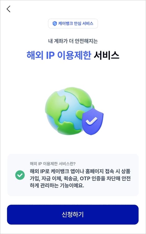 해당 서비스는 해외 아이피로 K뱅크 앱이나 PC 홈페이지에 접속할 경우 이체나 금융상품 가입, 퀵송금, 보안매체(OTP) 인증을 차단해 줍니다.