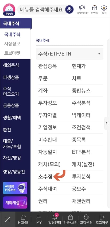 홈 화면 맨 하단 왼편에 메뉴(≡)를 선택하고 전체 화면으로 이동하면 국내주식에서 소수점 메뉴를 선택합니다.
