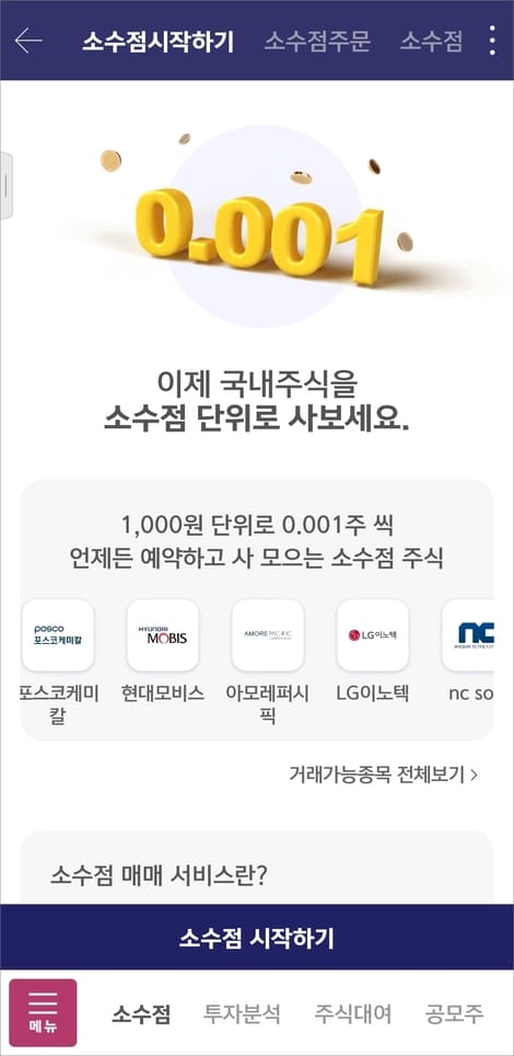 그중에 소수점거래(매매) 서비스도 이용 가능합니다. 국내주식을 소수점 단위로 매도/매수할 수 있는 서비스로 1천원 단위로 0.001주 씩 언제든 예약하고 매수할 수 있습니다.