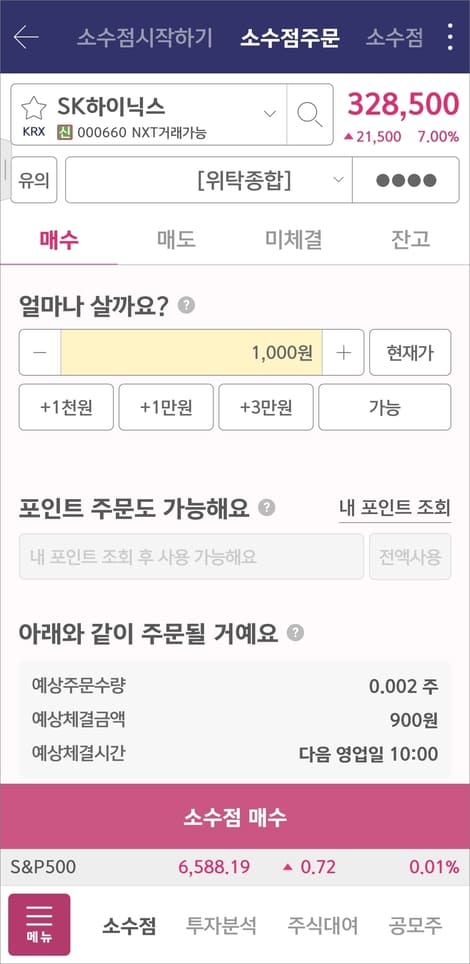 - 매수: 최소 1000원 이상 1천원 단위로 입력 가능