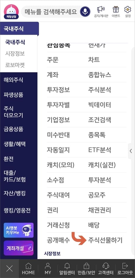 홈 화면 맨 하단 왼쪽에 3줄 메뉴(≡) 아이콘을 누르고, 전체 화면으로 이동하면 국내주식에서 주식선물하기에 들어갑니다.