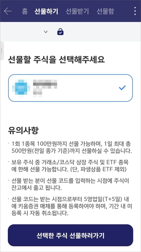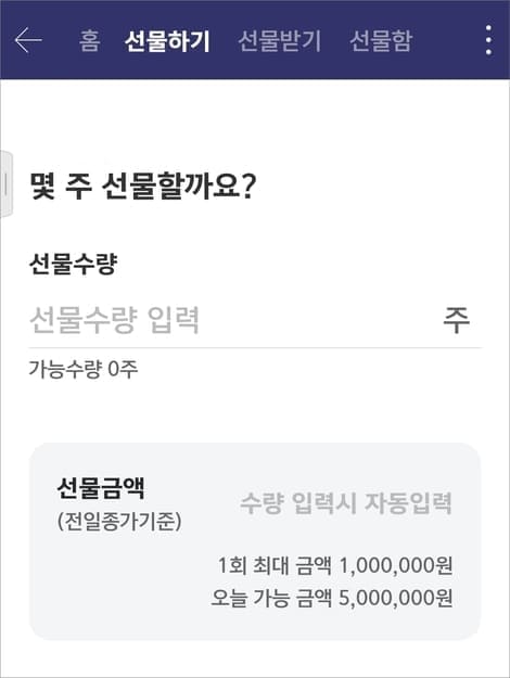 - 한 번에 1종목 1백만원까지 선물 가능하고 하루 최대 5백만원 한도 내에서 선물할 수 있습니다.