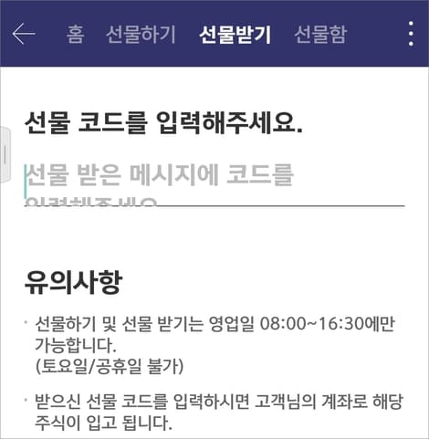 받는 사람은 해당 화면 상단에 선물받기를 선택하고 선물 받은 메시지에 코드를 입력해 주시면 됩니다.