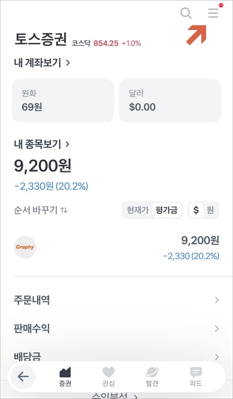 토스증권으로 이동하면 우측 상단에 가로 3줄 아이콘을 터치합니다.