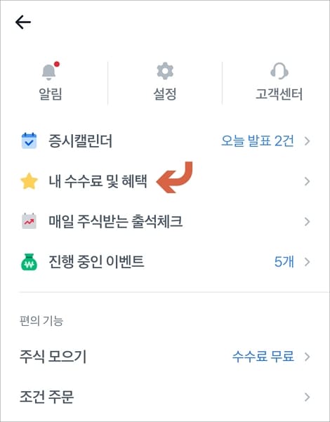 다음 화면에서 내 수수료 및 혜택에 들어갑니다.