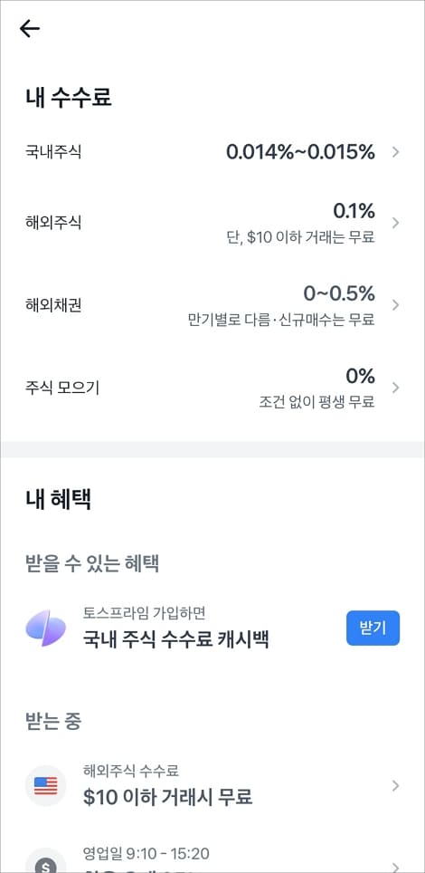 추가로 내가 받는 혜택과 받는 중인 혜택도 확인 가능한데요. 예를 들면 토스프라임 가입해서 국내주식 수수료 캐시백하거나 환율 우대, 실시간 시세 무료 등이 있습니다.