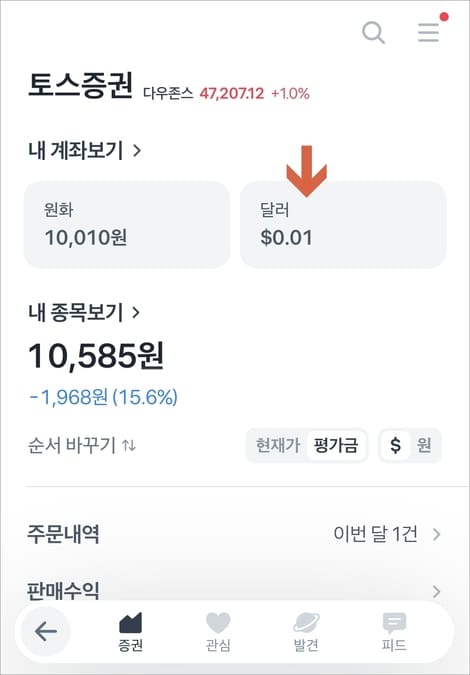 토스증권 화면으로 이동하면 상단에 내 계좌보기 바로 아래에 원화와 달러 잔액이 표시되어 있습니다.