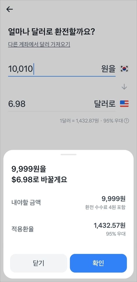 환전할 때 바로 내야 할 환전 수수료 금액과 적용 환율을 확인할 수 있습니다.