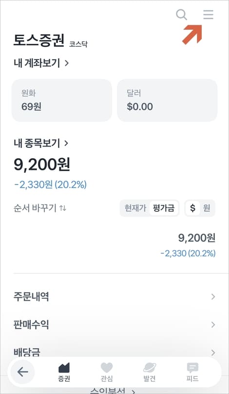 토스증권 화면으로 이동하면 우측 상단에 가로 3줄 모양 아이콘을 터치합니다.