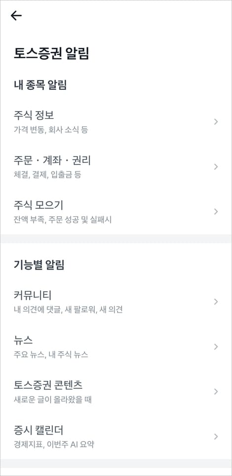 이외 커뮤니티(내 의견에 댓글/새 팔로워/새 의견), 뉴스(주요 뉴스 또는 내 주식 소식), 토스증권 콘텐츠(새로운 글이 올라왔을 때), 증시 캘린더(경제지표/이번주 AI 요약) 등을 설정할 수 있습니다.