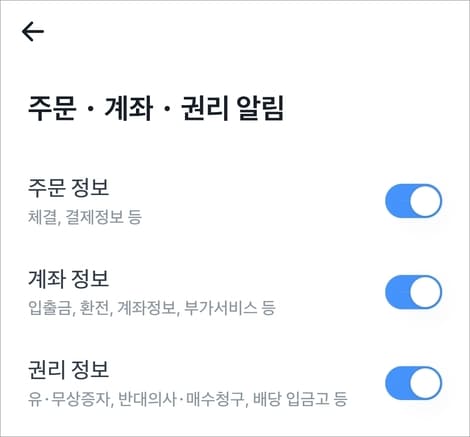 특히 주문·계좌·권리 각 알림 항목을 설정해두면 주식 거래 및 계좌 변동과 관련된 중요한 정보를 놓치지 않고 푸시(PUSH) 알림을 받아볼 수 있습니다.