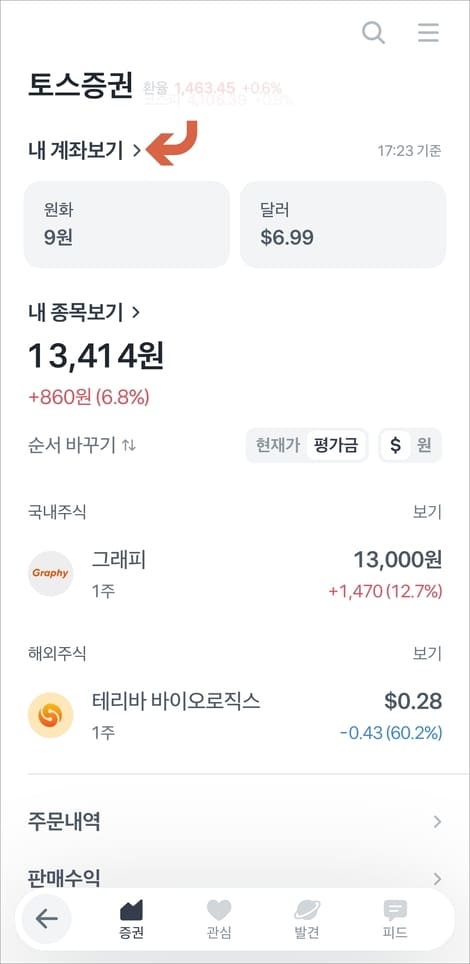 맨 하단에 증권 메뉴를 선택하고 다음 화면 상단에 내 계좌보기 글자를 터치합니다.