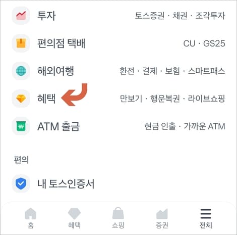 전체 화면으로 이동하면 혜택 메뉴를 선택합니다.