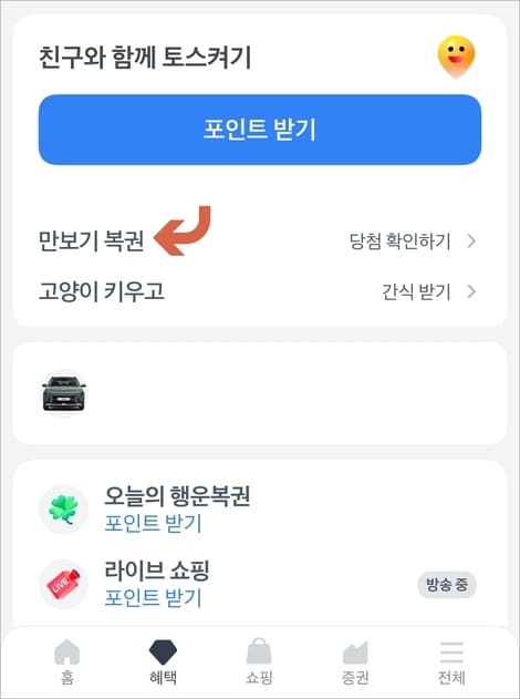 혜택 화면을 보시면 만보기 복권이 있는데 당첨 확인하기를 눌러줍니다.